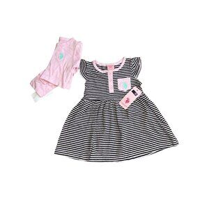 This adorable 3-piece set includes a pink cardigan, a black and white striped dress, and matching leggings. Ideal for stylish and comfortable everyday wear.