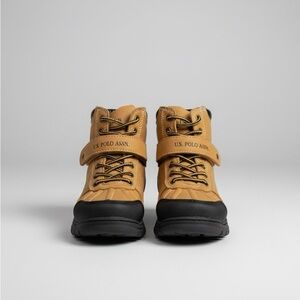 Durable camel and black boots by U.S. Polo Assn. Ideal for hiking and outdoor wear.