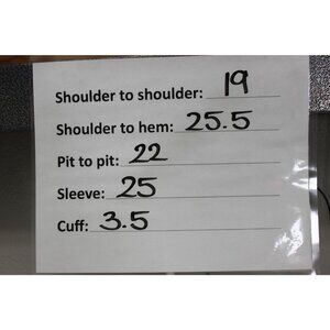 Pre-owned item with signs of use/wear: small spots of blemishes on front near hem and a line on sleeve.