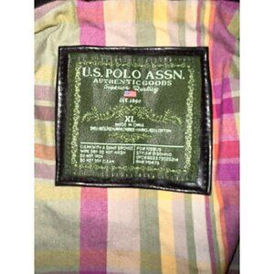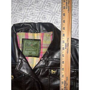 The U.S. Polo Assn Leather Jacket is a short-length motorcycle jacket for women made of polyvinylchloride material in solid brown color. It features long sleeves, a 100% cotton lining, and button accents. The jacket is available in XL size and is designed by the US Polo Assn. The style is a mix of hipster, army, beach, biker, grunge, bohemian, college, 80s, and 90s themes, making it a versatile piece for winter, fall, and spring seasons.