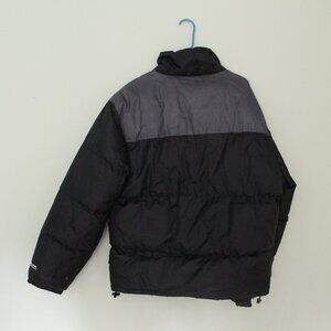 Durable fleece, puffer in good condition. Weighted with a waterproof outer layer, and a soft, fleece lined interior. Some signs of wear on the zippers, and a mark on one sleeve.