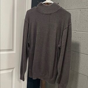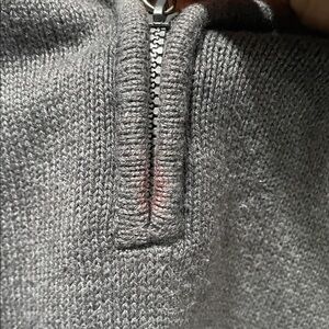 Stylish gray zip-up sweater. Features ribbed collar and cuffs. Iconic logo on chest.