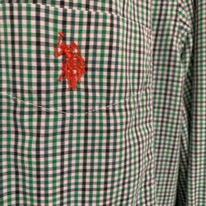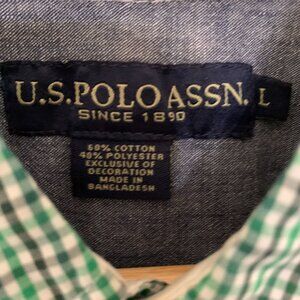 U.S. Polo Assn Men's Green Blue Plaid Button Down Size Large. Good condition has no rips or holes. Please note photo for a small discoloration on the sleeve.