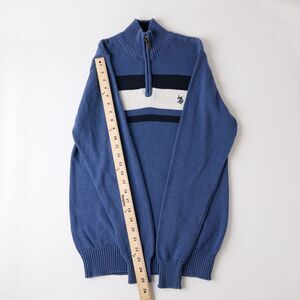 This US Polo Assn. quarter-zip sweater combines classic style with casual comfort. Featuring a blue knit design with bold navy and white stripe detailing, a ribbed mock neck, and a signature embroidered logo, this sweater is perfect for layering. The soft knit fabric provides warmth without bulk, making it ideal for cool weather and effortless preppy styling. Pair it with jeans for a laid-back look or chinos for a polished casual outfit.