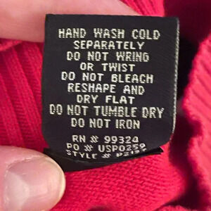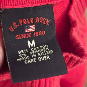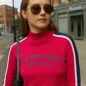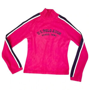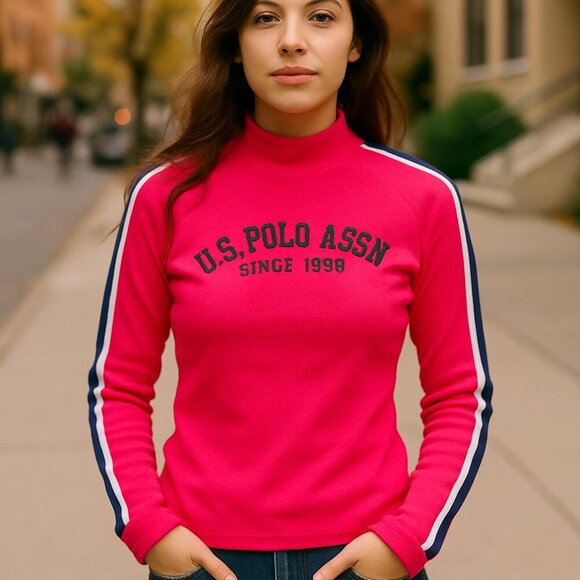 Sporty throwback US Polo Assn sweater with a ribbed mock neck and racing stripes down both sleeves. Raspberry-red body (reads hot pink under bright light) with navy/white sleeve stripes and raised U.S. POLO ASSN. SINCE 1890 lettering at chest. Soft stretch knit.