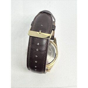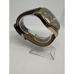 Elevate your style with the US Polo Assn Quartz Watch, designed for men who appreciate a blend of casual and sporty flair. The watch features a sleek round case in a striking gold tone, complemented by a brown faux leather strap that offers a comfortable fit for everyday wear. Its classic analog display, powered by a reliable quartz movement, is accentuated by clear Arabic numerals and baton indexes on a matching brown dial, ensuring easy reading at a glance.