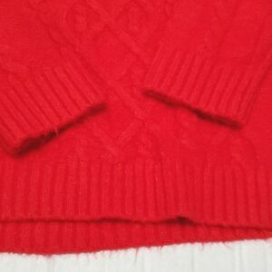 Red crew neck cable knit long sleeves sweater. Cable knit pattern is on on the front. Ribbed knitted neckline, cuffs and bottom hem. Boxy construction. Embroidered logo on the chest. Made of 72% acrylic, 24% nylon and 4% spandex.