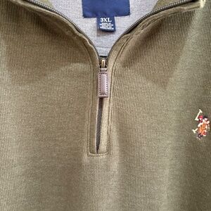 Elevate your wardrobe with this classic U.S. Polo Assn. quarter-zip pullover in an olive green hue. Featuring a mock collar, relaxed fit, and soft knit texture—it's perfect for layering or casual wear. Size 3XL (Big & Tall). Excellent condition with minimal signs of wear.