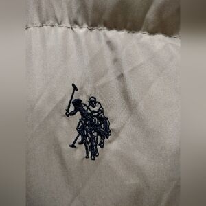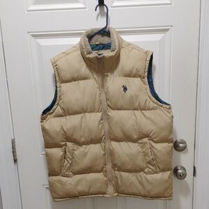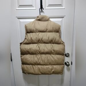 Classic tan puffer vest with cozy lining. Ideal for layering in cooler weather. Features signature logo detail.
