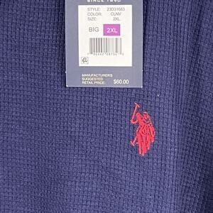 Men’s U.S. Polo Assn. Thermal Long Sleeve Shirt – Size 2XL. Classic blue waffle knit thermal designed for warmth and comfort. Features a long sleeve crewneck style in a soft 60% cotton / 40% polyester blend. Measures 28" pit to pit x 32" length for a tall and roomy fit. New With Tags (NWT), retail $60. Perfect for layering in cold weather, casual wear, or as a thoughtful gift.