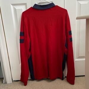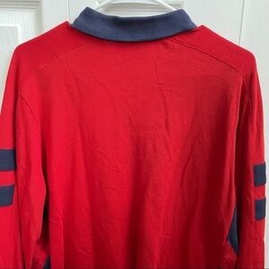 Bold red polo with navy details. Features classic collar and embroidered logo. Ideal for everyday style.