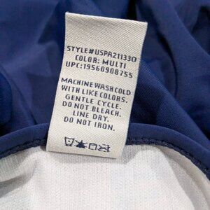 US Polo Assn. women's long sleeve one-piece swimsuit in size M (7–9), featuring a navy blue base with red, white, and turquoise floral accents. Made from a nylon/spandex blend, this suit includes a tie back, padded bra, and offers a comfortable stretch. Pre-owned with some color run inside the chest area as shown, but no pilling and overall clean. Measures approximately 16" armpit to armpit, 27.5" from shoulder to crotch, and 23" sleeve length from shoulder seam to cuff. Machine wash, line dry.