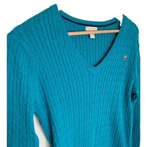 US Polo Assn Womens Long Sleeve Pullover Cable Knit Sweater Teal M V-Neck Logo