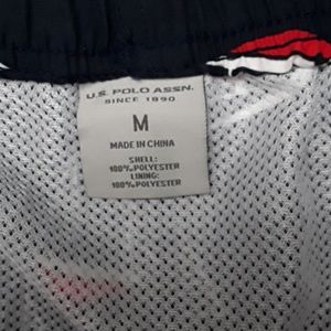 U.S. Polo Assn Sailboat Swim Shorts in navy and red. Drawstring closure. Machine wash. 100% polyester.
