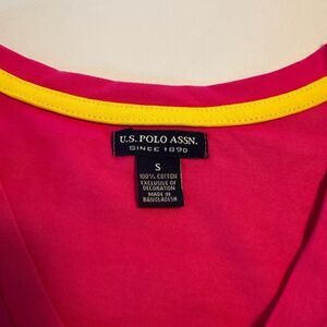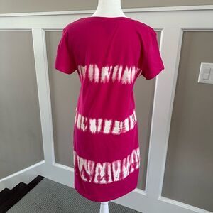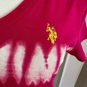 Step out in style in this pink and white Tie-dye and striped pullover, short sleeved tee dress by US Polo Association. Yellow logo detail on chest. 100 % cotton with v-neck. L 34” x Width 17” pit to pit.