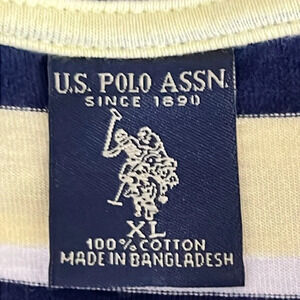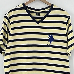 US Polo Big Pony Cotton V Neck Short Sleeve Striped T Shirt - Size XL. Great pre-owned condition. Measures a bit small for the tagged size. Please refer to measurements provided to ensure fit. Navy, yellow and white stripes. Short sleeves, V neckline, 100% cotton, embroidered big pony, straight hemline. Approximate measurements: 23" pit to pit, 30" length.