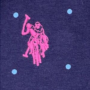 Navy blue with light blue Polk-a-dots and a pink embroidered polo player