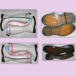 Funky boots that were reportedly worn only once for an indoor photo shoot! With lightly glittered outsoles and metal-tipped neon-rainbow laces. I took the time to add heel and toe-guards so that they'll last you many years to come. If you'd like any more pictures or if you have any questions, please don't hesitate to contact me =) -Johnny-