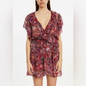 This IRO sundress features a vibrant red and pink color palette, perfect for a casual day out or a night on the town. The dress showcases a flattering wrap design with a V-neckline and flutter sleeves, complemented by ruffled details that add a touch of elegance. Its midi length and lightweight fabric make it ideal for resort wear, offering both comfort and style.