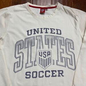 Hit the stands or the streets in this officially licensed USMNT States Long Sleeve Tee in men's size M. Made of 100% cotton, this pre owned cream tee is in good condition, ready for you to represent Team USA. Stay cozy and on-trend with this long sleeve tee that's a must-have for any die-hard US Soccer fan.