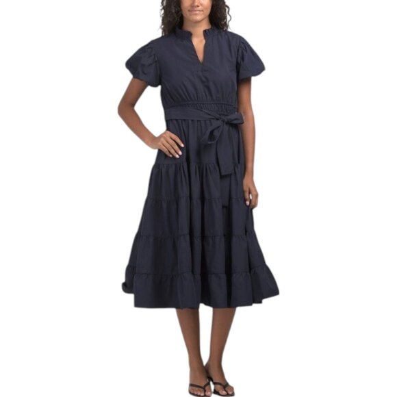 US TOGETHER Puff Sleeve Tiered Midi Dress - Navy