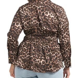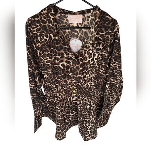 This top features a sophisticated button-down style with a notched collar and a flattering peplum design. The tan and brown color palette adds a touch of elegance, making it a versatile addition to any wardrobe. Its tailored fit ensures a chic and comfortable wear.