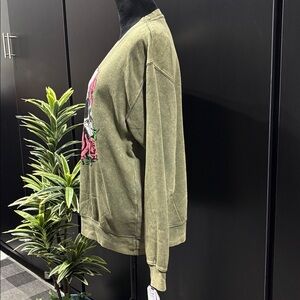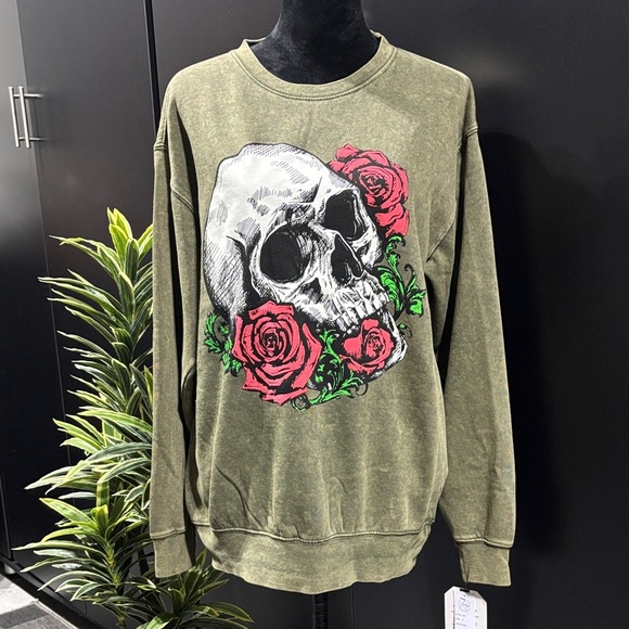 U.S. Vintage Fleece lined pullover sweatshirt, skull & raised roses,washed olive