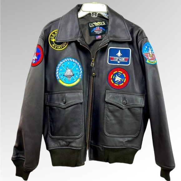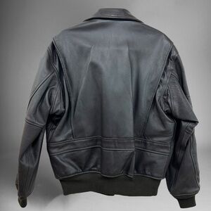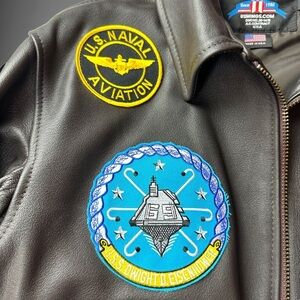 Signature Series G-1 Bomber Jacket with assortment of authentic Fighter Weapons School and Naval Aviation Patches. Proudly handcrafted and made in the USA. Received as gift, worn once by spouse. Heavy. Dark brown. 100% leather, inside map pocket, knit cuffs and waistband, brass zipper.