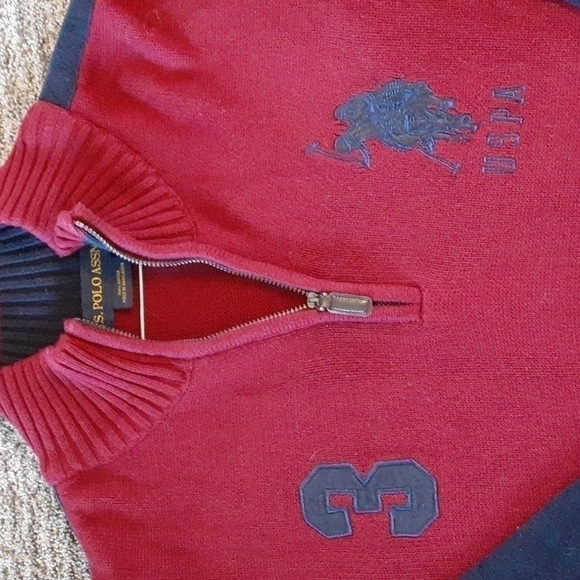 u.s. polo Association men's quarter zip burgundy and blue embroidered large Polo spell out sweater in great condition no rips holes or stains see pictures for lay flat measurements large pony. Large Old money preppy ski lodge rugby