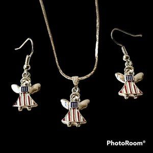 USA American Flag Necklace Earrings Set Angel Patriotic July 4th Enamel 18"