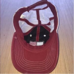 D2 Hat/Cap Academy, Ltd. Bangladesh Adult Adjustable Hook & Loop Strap American Flag Stars & stripes art patch on face in RWB / 2 tone trucker hat with Maroon front dome and bill and strap with white accents plus white mesh rear dome Maroon White 100%/100% Cotton/Poly