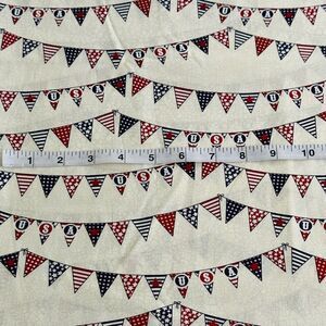 DESCRIPTION: Patriotic Red & Blue Banner/Pendant Flag Fabric on Cream Marbled Background by Joann's.