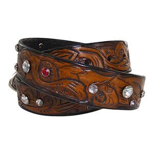 Elevate your Western look with this handmade leather belt by F-bomb Custom Leather, crafted in the USA with bold artisan detailing. This genuine leather piece features a deeply embossed floral scroll pattern, rhinestone embellishments in clear, red, and iridescent hues, and filigree-engraved silver-tone hardware.