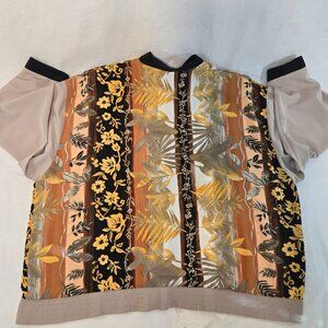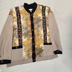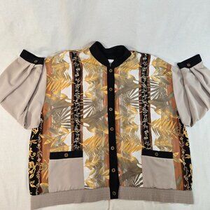 PETER POPOVITCH Vintage Retro UNISEX Art To Wear Disco Silky Tan/ Beige Multicolor Floral Printed Bomber Jacket Size X-LARGE. Made in U.S.A!!!