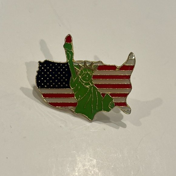 Preowned but clean and in good condition. Gold color backing. 1 x 1.13" in size. With backing. Lapel pin. USA Country outline map with Statue of Liberty in middle. USA Flag background. Minor signs of wear.