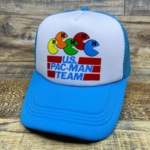 USA Pacman Team Mens Trucker Hat Blue Snapback 80s Retro Logo Video Game Cap