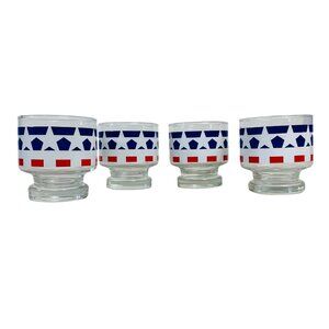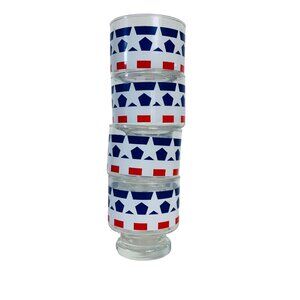 cocktail glasses, 70s drinkware, vintage glasses, patriotic decor, red white blue, star pattern, glassware set, americana style, retro drinkware, classic design, party glasses, collectible glass, sturdy glass, set of 4, home bar