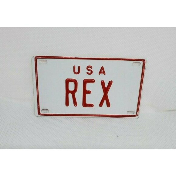 Rex mini license plate, personalized bike plate, collectible bicycle tag, white red mini plate, USA bike license, custom name plate, vintage bike accessory, novelty mini tag, cycling memorabilia, retro license plate