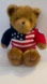 Adorable teddy bear wearing a red and white striped sweater with 'USA' patch and a blue knit hat.