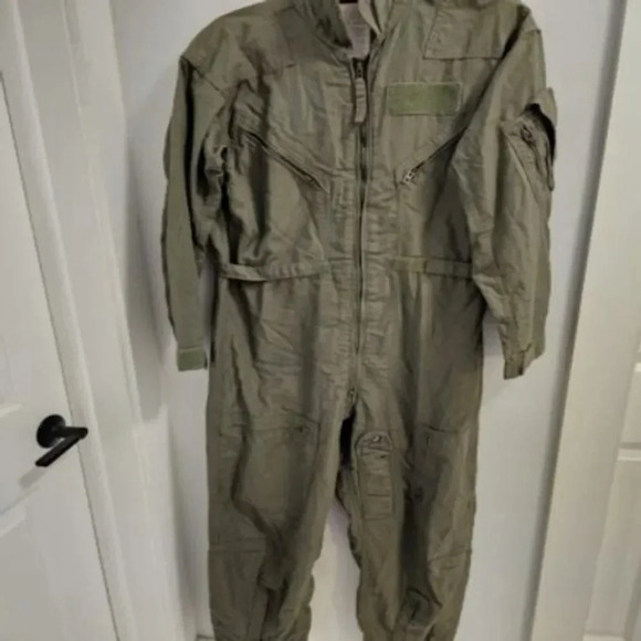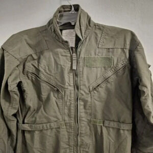 USAF Coveralls Flyers Fire Resistant Summer Men 40 Regular Sage Green CWU-27/P. Has flaws. Bad sew job on back backside area. Had two black dots on back leg area. And black stamp making on back. Has small holes from where patches/stitching was removed. See photos.