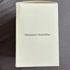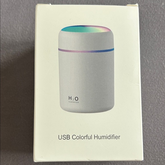 Compact USB humidifier with a sleek white design and colorful LED light accents. Perfect for adding moisture to the air. New in box. Never used. Box dented a little. Non smoking home. Bundle and save