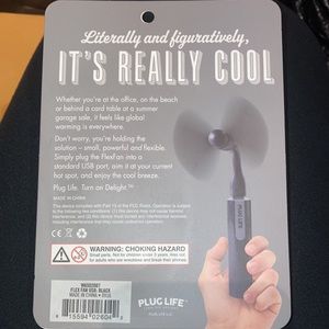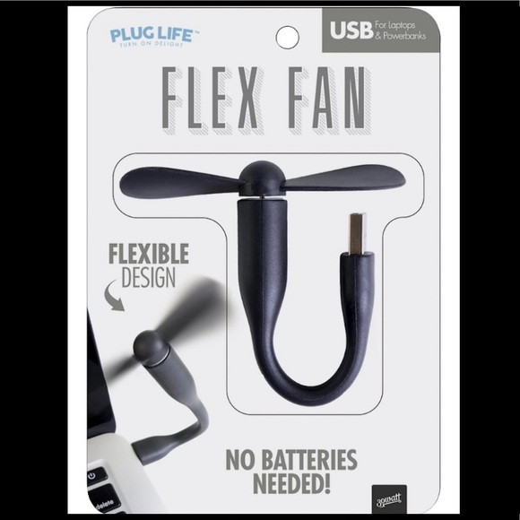 Black USB portable fan. Plugs into any usb device (computer, laptops, power bricks, etc.)