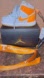 Vibrant Jordan sneakers for kids. White base with striking orange accents.