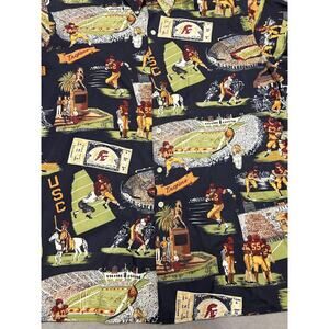Design: Allover collegiate print featuring USC Trojans football scenes, stadium views, cheerleaders, banners, and USC/Trojans text with interlocking SC marks