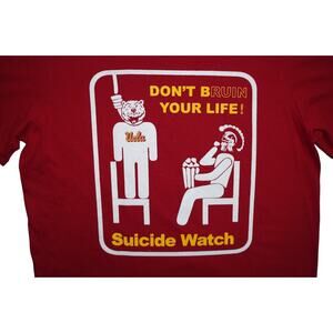 Rare and bold USC Trojans rivalry graphic tee featuring a dark-humor "Suicide Watch" design mocking UCLA. Printed on a soft red 100% cotton tee with tree-graphic printed tag, made in Honduras. Unisex adult size XL. Graphic shows UCLA bear and USC Trojan character in a rivalry skit. A controversial collector’s piece perfect for die-hard USC fans or college rivalry collectors.