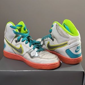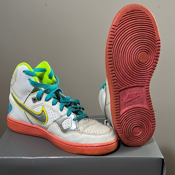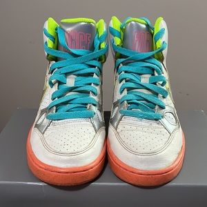Women’s size 6 Nike Force Shoes,, white, pinkish, yellow, silver and a neon green in color,, blue laces. Needs a good cleaning.