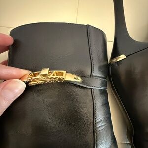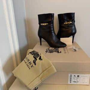 Burberry Heritage Lock Hainault ankle boots come with their original shoe box, dust bag, spare heel heads and booklet. Sexy but very comfortable boots. I always struggle to find the right arch support, but anytime I wore these boots felt like I was on a cloud. If they fit me I would still keep them. They are made of smooth leather, almond toe and stiletto heels. There are some visible signs of wear like scuffing and discoloration of the login on the back of the shoe from driving. Refer to pictures for more details in their condition. Love them!!! I resisted for a long time not to give away but it’s time for wardrobe downsizing. Make your offer :)