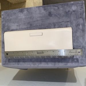 This is a larger clutch measuring 13.5 inch length, 5.5 inch height, and just under 2 inch depth. There are no visible signs of wear/damage on exterior, and only a small pink stain on interior lining. Has magnetic button closure, interior zip pocket, lovely cream/ivory and black color-blocking with an accent pattern containing both colors. Very neutral and versatile, easy to match.
