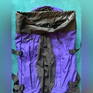North Face Hiking Backpack in purple and black. Only used once!! Waterproof interior, tons of pockets, cinch closure at top, and waist strap.