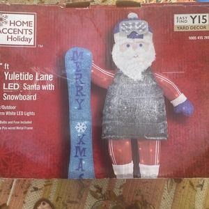 ***USED-OPEN BOX Home Accents Holiday 4 FT Yuletide Lane LED Santa with Snowboard This head-turning yard sculpture will be the star of your holiday display. The Home Accents Holiday 4 FT Yuletide Lane LED Santa with Snowboard featured 70 stunning LED lights is made with a durable metal frame and weather-resistant fabric. Use this classic character, who's riding a snowboard, in indoor or outdoor spaces. The long-lasting bulbs remain cool to the touch and will shine through the season. The sculpture is easy to set up, and it includes ground stakes.